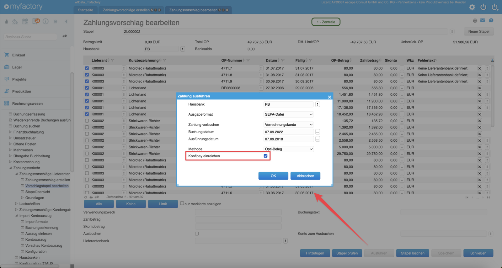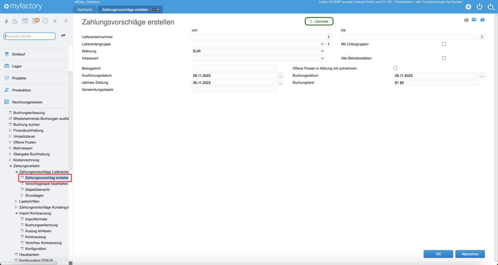 Wie gewohnt wird innerhalb der Myfactory ERP-Software ein Zahlungsvorschlag erzeugt. Den gleichnamigen Menüpunkt erreichst Du über den Hauptmenüpunkt Rechnungswesen / Zahlungsverkehr / Zahlungsvorschläge / Zahlungsvorschläge erstellen. In dem Dialog hast du die Möglichkeiten die Zahlungsvorschlagsgenierung, beispielsweise nach einem bestimmten Datumsbereich, einem Beitragslimit oder auf bestimmte Lieferanten einer Gruppe, einzugrenzen.