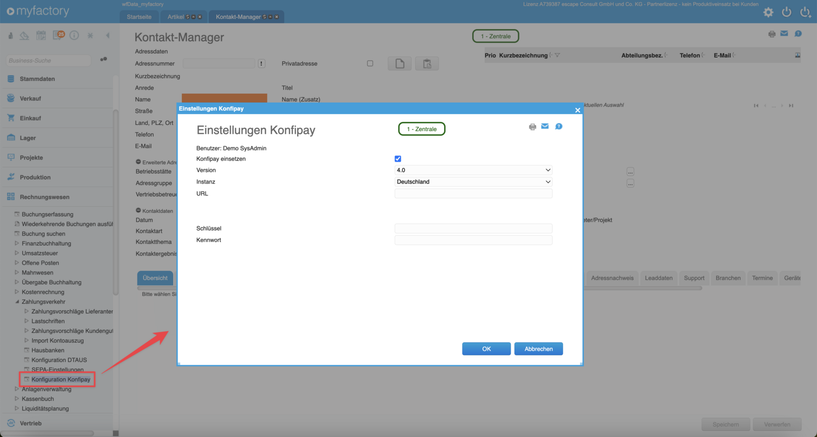 Um Konfipay in der myfactory verwenden zu können, musst Du es zunächst aktivieren. Klicke dazu einfach auf das Häkchen neben der Option "Konfipay einsetzen" im Konfigurationsdialog.