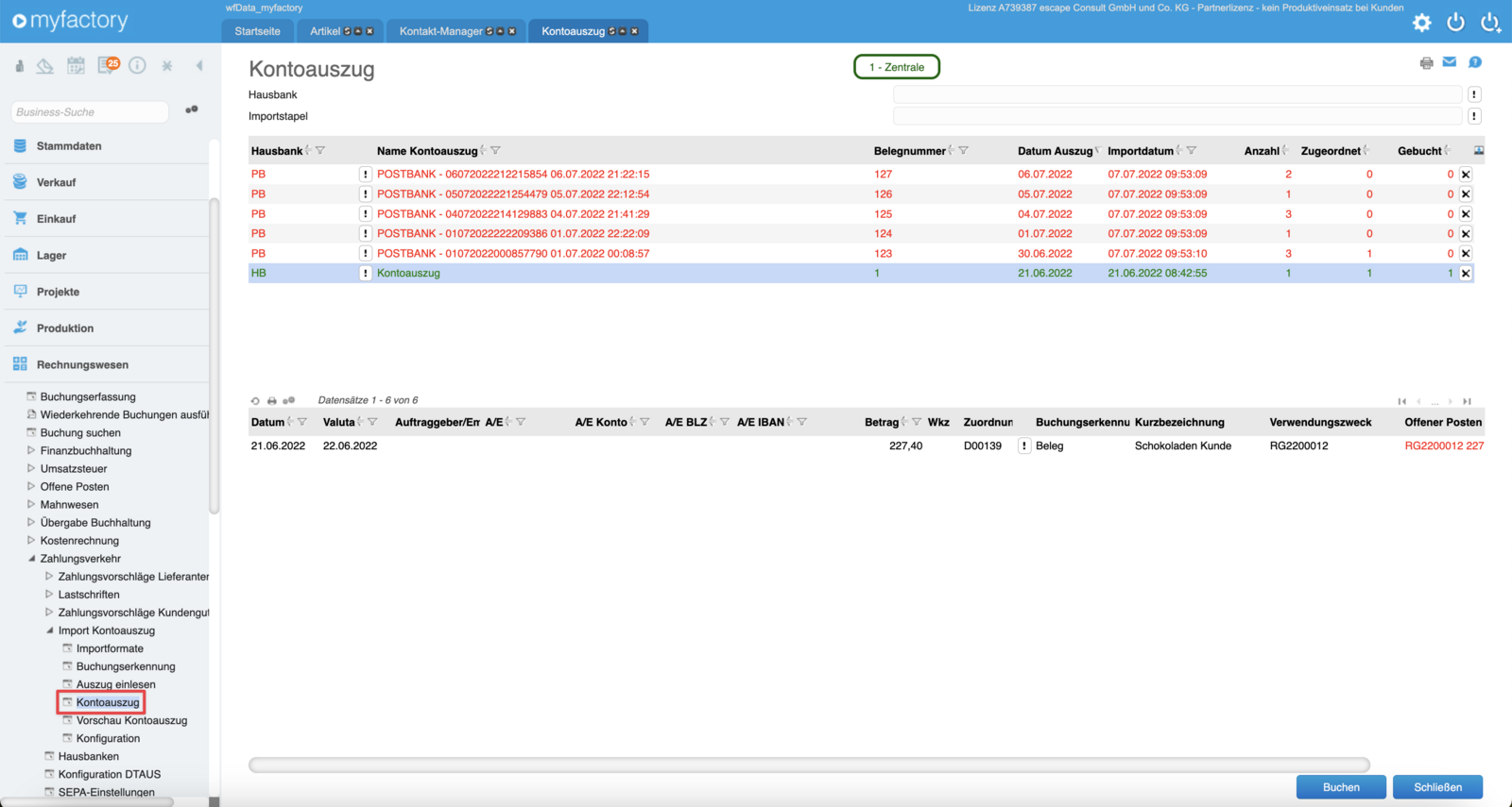 An dieser Stelle findest Du nun alle Kontoauszüge, die importiert wurden. Diejenigen Auszüge, die rot markiert sind, wurden noch nicht in die Myfactory Finanzbuchhaltung übergeben.