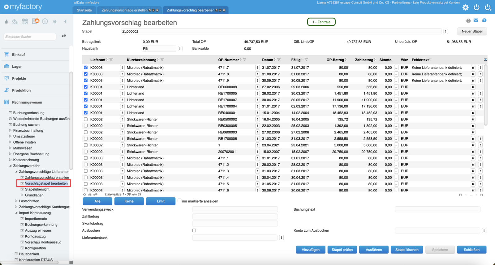 Innerhalb des Stapels mit Zahlungsvorschlägen hast Du wiederum verschiedene Optionen, um Deine Auswahl an möglichen Überweisungen zu präzisieren. Im oberen Teil kannst Du bestimmen, von welcher Bank die Zahlungen erfolgen sollen. Ebenso ist es möglich, bestimmte Belege aus dem Zahlungsvorschlag herauszunehmen mithilfe der Checkboxen. Im unteren Bereich kannst Du den Verwendungszweck, Buchungstext und Zahlungstext usw., bei ausgewählten Belegen einsehen oder anpassen.